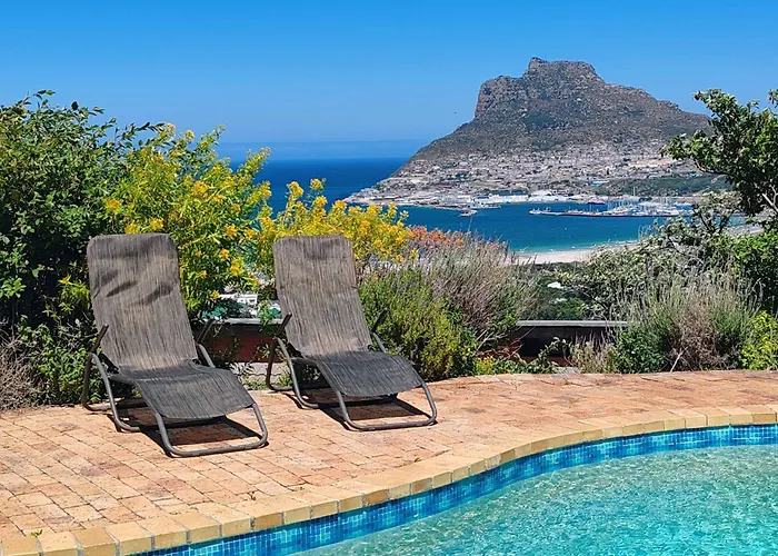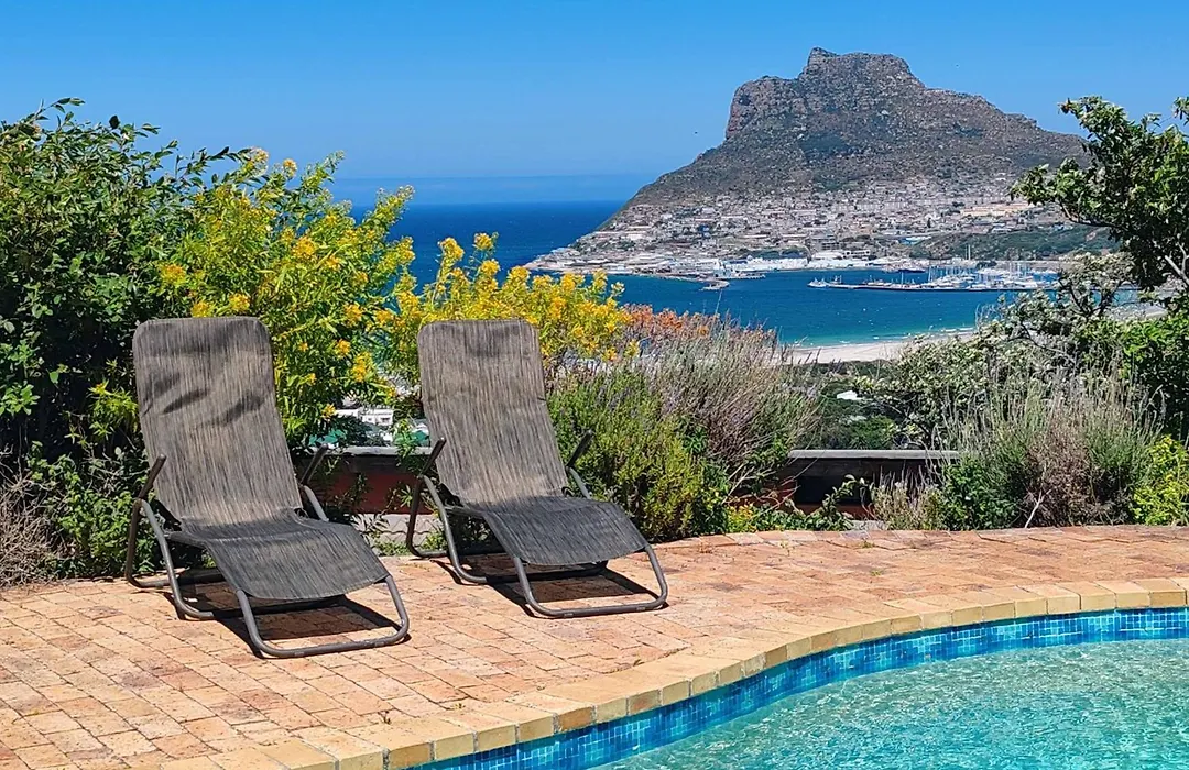 Guests can enjoy a seaside sea view from a patio at Sunset Bay Stay Hout Bay villa, about a 25-minute walk from the Seal Island.